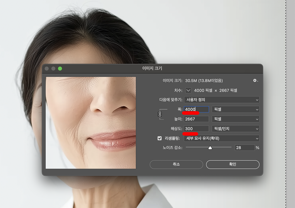 | 품질 문제 | 저해상도, 노이즈, 흐림 | 미드저니 업스케일링 이후 포토샵에서 해상도 300, 이미지크기 4000px 수정 |