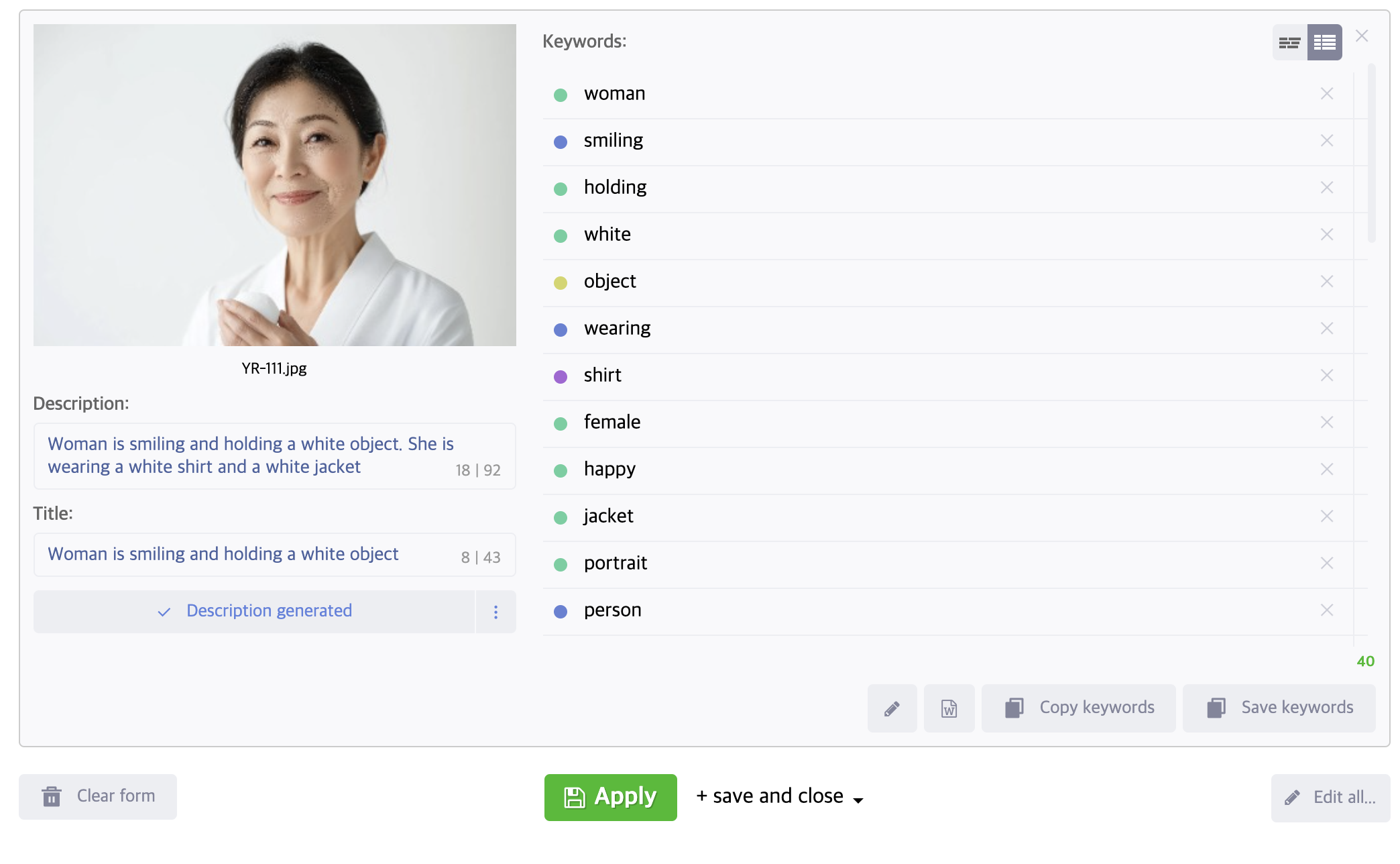 그럼에도 불구하고, 스톡사진을 몇십 장 올리고 끝낼 게 아니라면 강력히 추천한다. 태그와 제목 입력 과정에서 소모되는 시간을 줄이고 더 많은 이미지 업로드와 창작에 집중할 수 있도록 도와주는 도구이기 때문이다. 효율성을 극대화하고 싶다면 적극적으로 활용해볼 만한 가치가 있다.