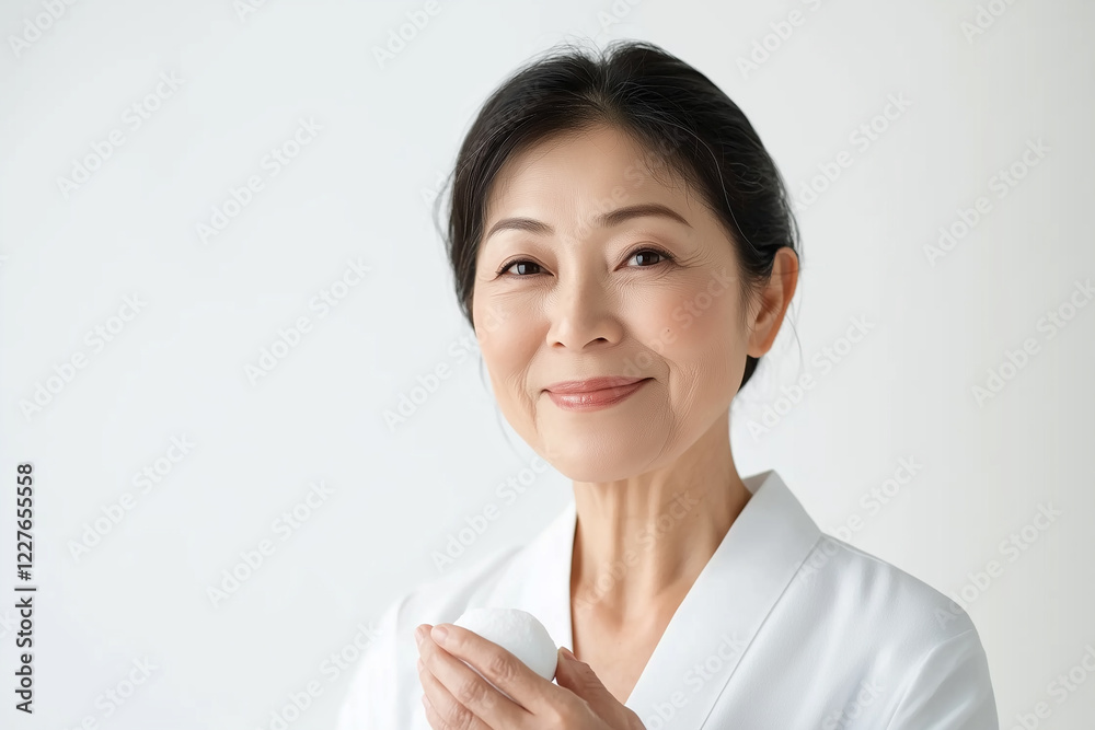 Senior asian woman is holding a white object in her hand 스톡 사진 | Adobe Stock